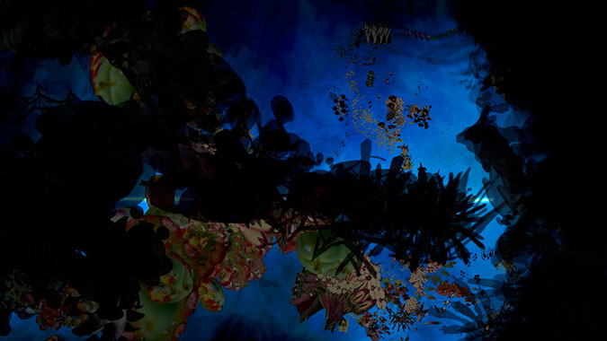 Hunkering down these past months, Kim sought solace in the details. Inventing libraries of custom particle emitters, Kim links these new "brushes" to her ongoing love of drawing and the micro-sensitivity of the gesture. Trails form clusters that float, momentarily obfuscate then dematerialize. (d(e)volve) is based on an online performance with longtime collaborator and sound designer Paul Chavez, exploring the means that are available to us now to still connect in the moment through attentive improvisation.