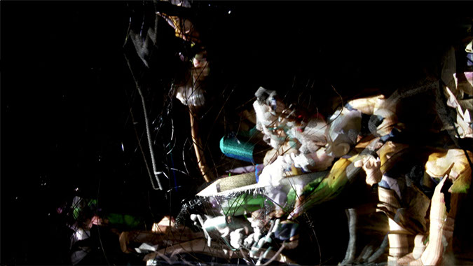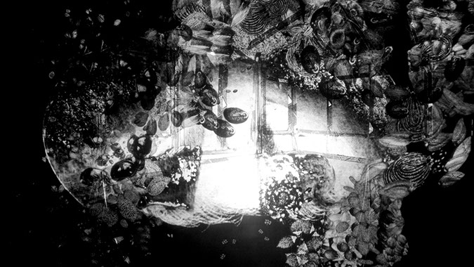 It is from this observational point of view, peppered by imagery from shared books read (China Mieville, Susanna Clarke), that I conjured the visuals for this soundscape. Through frequency analysis, I connect the aural impulses to an equally reactive visual nervous system that floats and spasms to the very sounds that animate the organism. The smallest change in variable produces markedly different behaviors. With a deeply rooted fascination by the way video projection behaves with different physical materials, I created two micro installations, one of dried plant matter and the other of glass and wax paper. The view from live cameras are composited in real time to give this organism space to move and breathe. A fine-tuned interaction of close observation and response allow for this world to bloom and unfold.