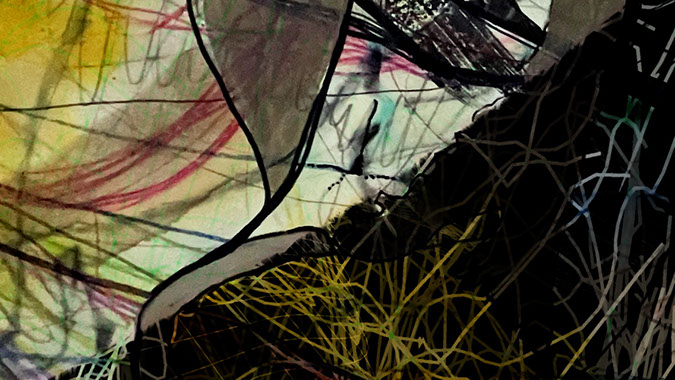 In celebration of the completion of Vinny Golia's mammoth project, "Even to This Day..." Movement One - Inoculation in 12 sections/modules, Vinny invited Carole to listen to a subset of the whole and select 5 pieces to respond to visually. To find a way into this mammoth oeuvre, Carole invited Vinny to do a collaborative improvisatory drawing while listening to the music. From a bed of multicolor, squirrely lines, forms emerged. This became the visual basis for Persistence Gombus and opened up a point of entry into further compositions.