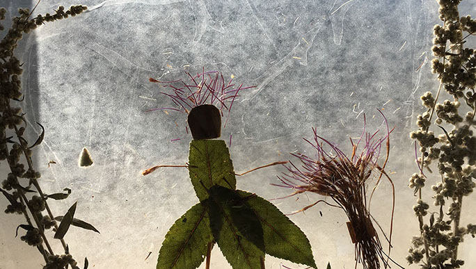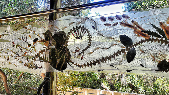 Utilizing foraged organic plant matter from the gardens, we created these translucent window pieces that would be illuminated from behind to reveal nature's wondrous palette of color and textures.