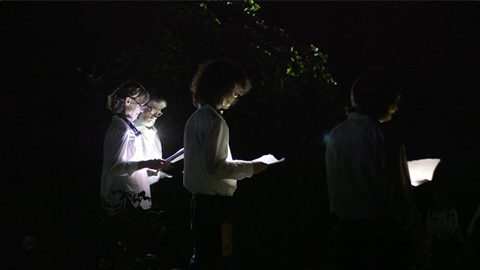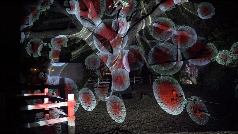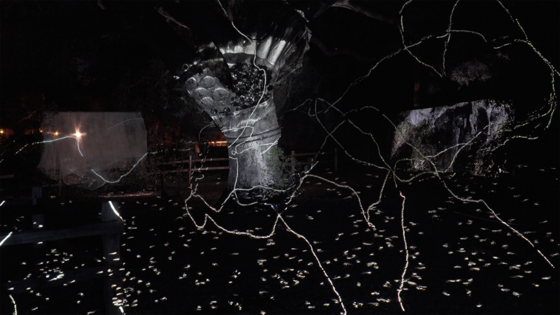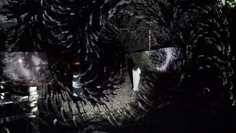 Conceived and directed by artist-in-residence Carole Kim, “The seed will search” is a multimedia performance within Descanso Gardens that furthers Kim's ongoing investigation of landscape as a dimensional canvas for light, image, sound, text, body. In 1878, a devastating wildfire, the first recorded of its kind in LA County, swept through the region. Descanso Gardens is known for its canopy of old native California Live Oak Trees. There are five Heritage Oaks that survived this fire. Their forms speak to a gnarly resilience, persistence and perseverance that this performance taps into. The title is a line from the poem "The Weeping Mulberry Tree for four voices" written by John Levy for this performance.