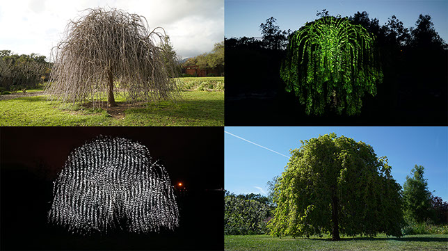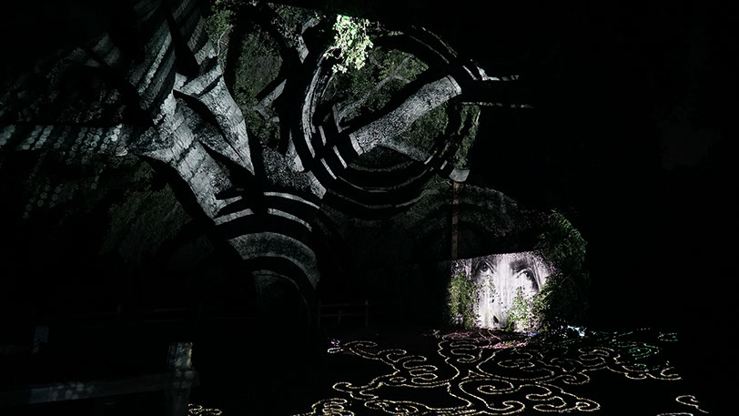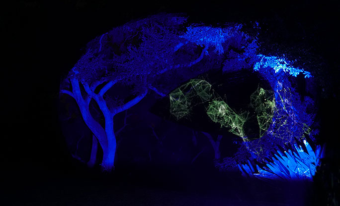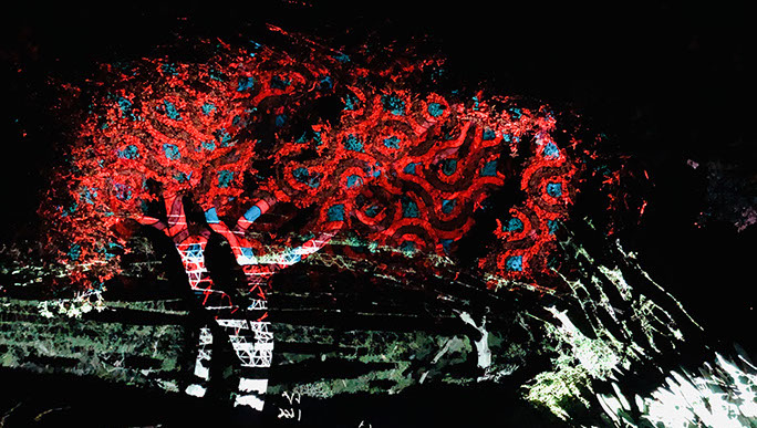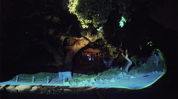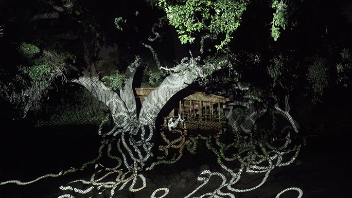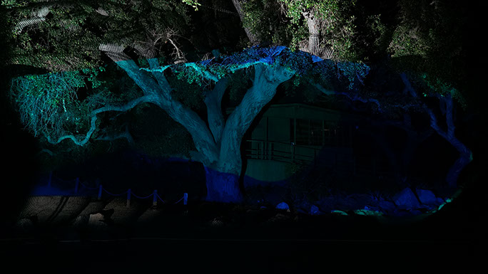This particular Heritage Oak is the most impressive of the five with a canopy that extends down to the ground, holding space for this night-time exploration from root-to-crown under the careful watch of Bark Woman.