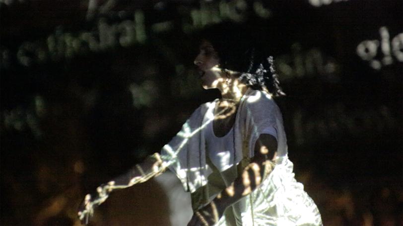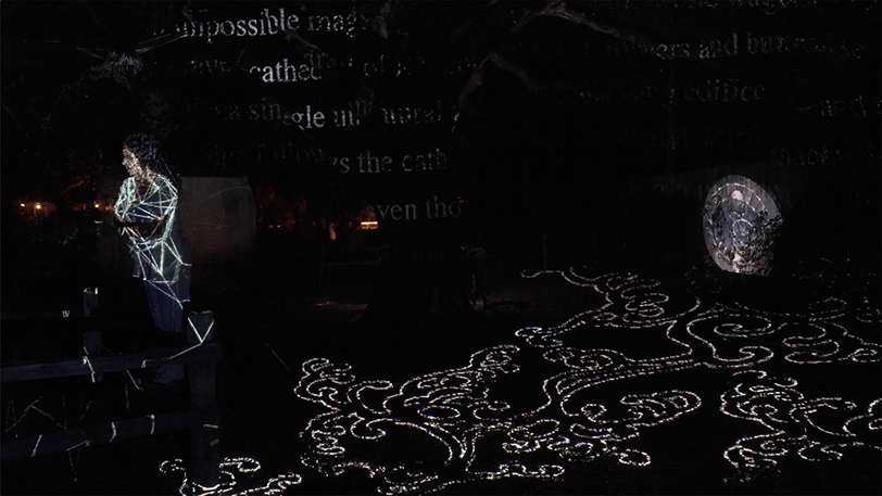 “BARK” was a 2-hr durational multimedia performance within Descanso Gardens that furthers artist-in-residence Carole Kim's ongoing investigation of landscape as a dimensional canvas for light, image, sound, text, body. In 1878, a devastating wildfire, the first recorded of its kind in LA County, swept through the region. Descanso Gardens is known for its canopy of old native California Live Oak Trees. There are five Heritage Oaks that survived this fire. Their forms speak to a gnarly resilience, persistence and perseverance that this performance tapped into.