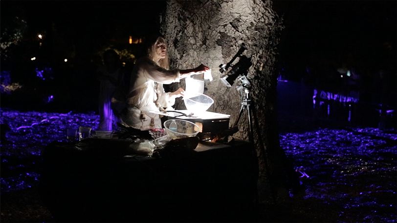 “BARK” was a 2-hr durational multimedia performance within Descanso Gardens. Within the rose garden, the most impressive of the five Heritage Oak trees reigns supreme with a canopy that extends down to the ground. Holding space for this night-time exploration from root-to-crown under the careful watch of Bark Woman...