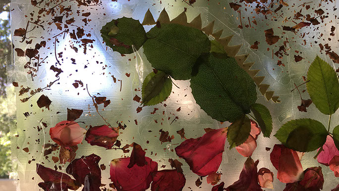 Utilizing foraged organic plant matter from the gardens, we created these translucent window pieces that would be illuminated from behind to reveal nature's wondrous palette of color and textures.16
