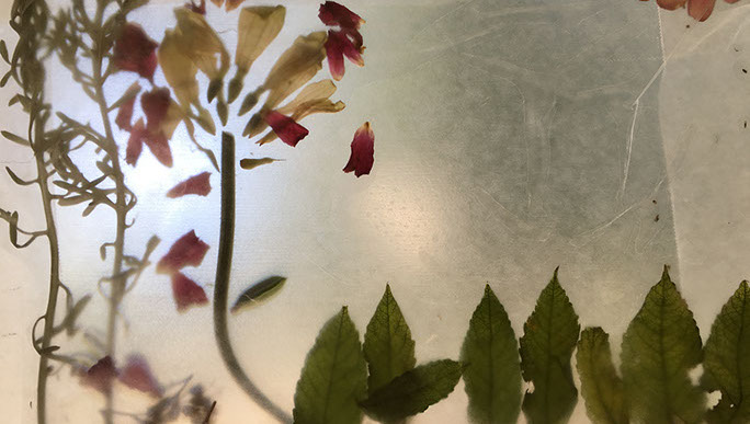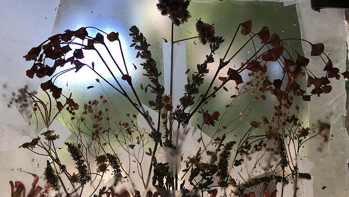 Utilizing foraged organic plant matter from the gardens, we created these translucent window pieces that would be illuminated from behind to reveal nature's wondrous palette of color and textures.18