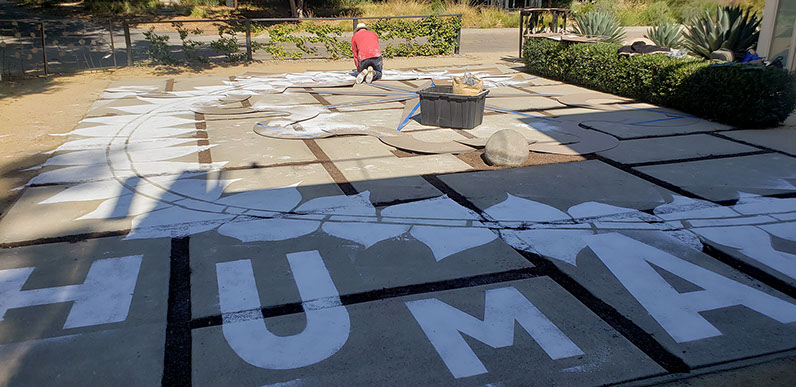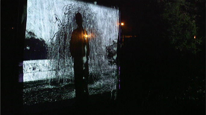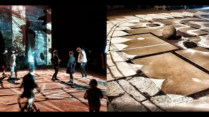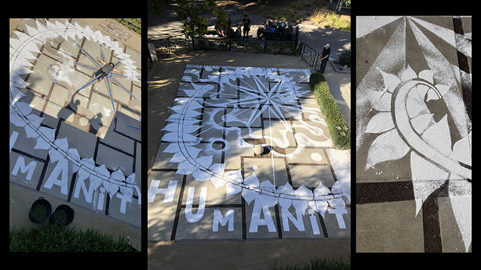 In addition to being the last chance to see the exhibition in the Sturt Haaga Gallery, this event featured the opportunity to walk upon a collaborative white-powder-stenciled "Carpet of Humanity" in all its fragility, experience the multi-layered embodied presence of dancers within the video installation "ODE," and observe an evolving projection drawing within the oak grove near the gallery.