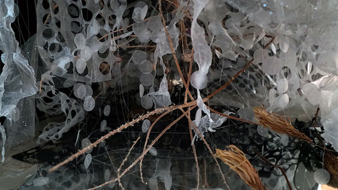 The title AERIAL refers to the desire for the long view, the perspective that allows for both observation from a distance and inspired understanding in charting one's course. Consistently playing with the perception of scale in Kim's under-the-kitchen-table micro installations, "Aerial" reflects a tenuousness of solidity. Stability/instability.