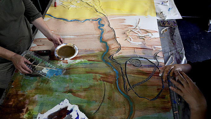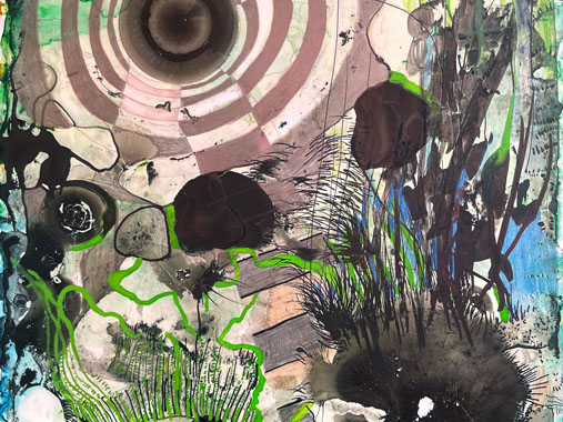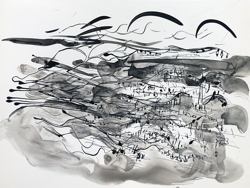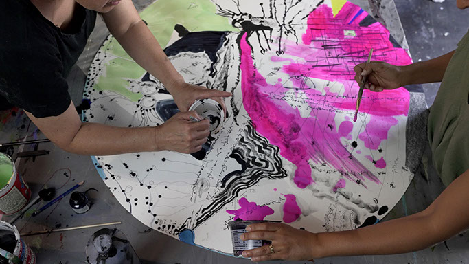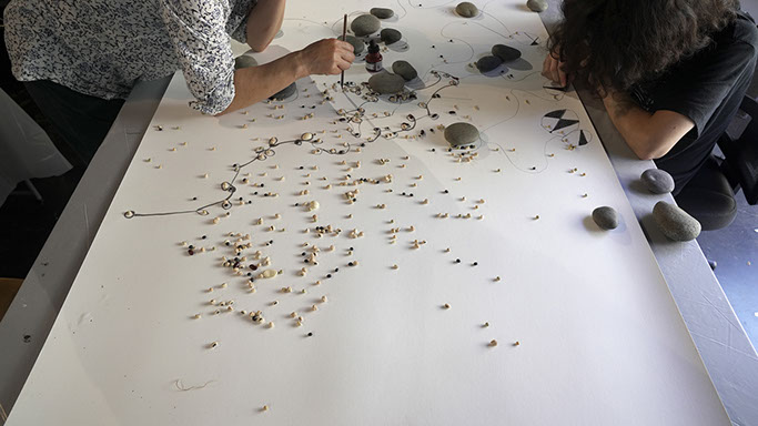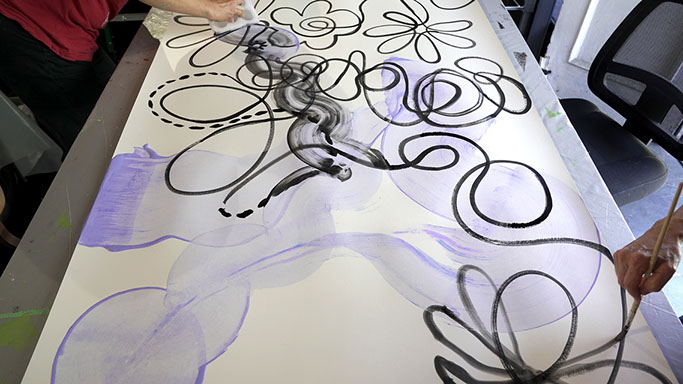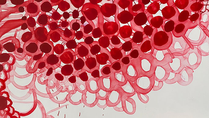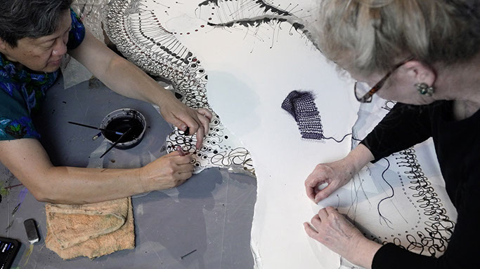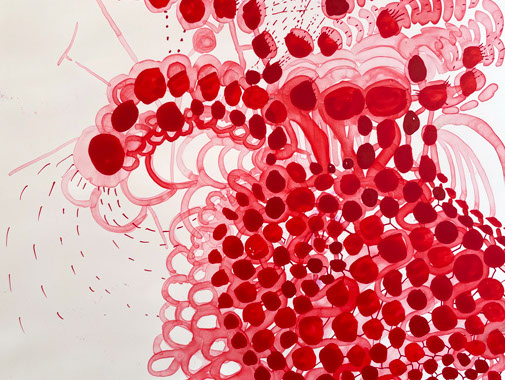 R: I brought a continuous line that I am currently exploring in my paintings. I was surprised and delighted how collaborating with Carole disrupted my process and opened new avenues of continuing.