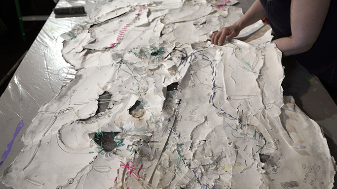 L: We started the paper with the big moves: Rupture, Mark and Rip and then changed the rhythm to reassemble and stitch. Carole had to kick me out as I would have stayed all night pushing threads through the paper.