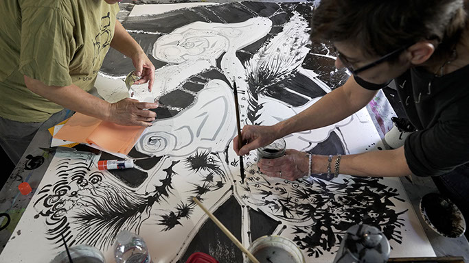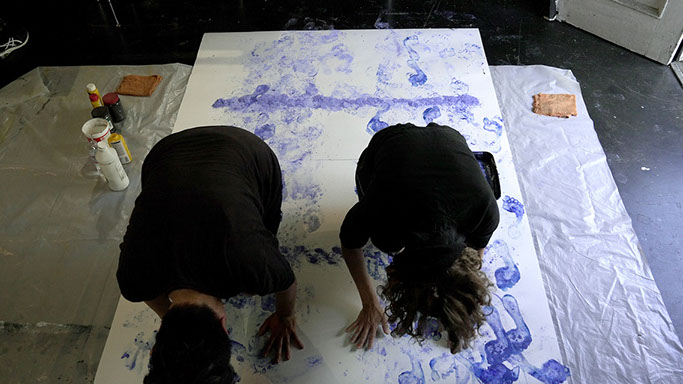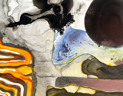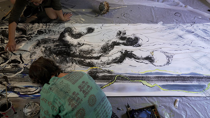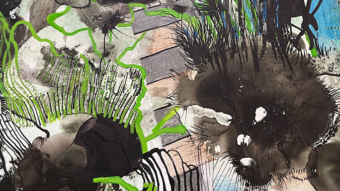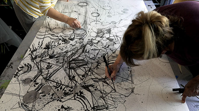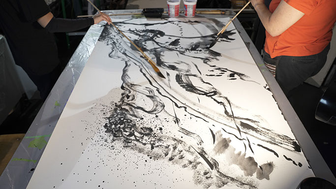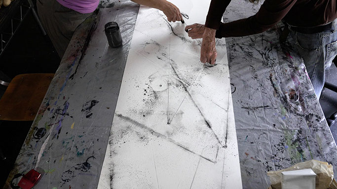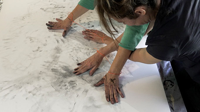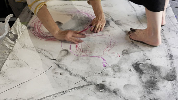 A: Even before meeting, Carole magically intuited my drawing process and proposed a surprising and joyful amplification. We tied our hands together, closed our eyes, and drew directly with our fingers on the paper, mapping breath and movement in real time. Wells of saturated charcoal and graphite, atmospheres connected with ikebana color shapes. And layered again.