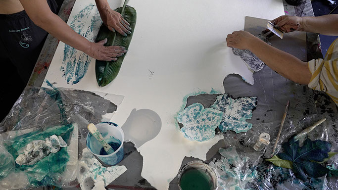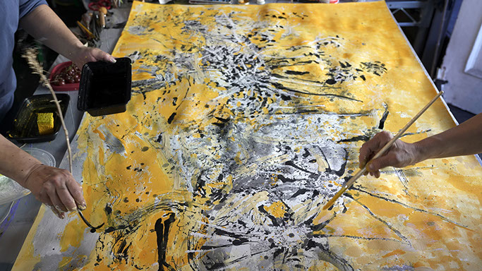 Carole stuck to plant matter as brushes for this one. The hollyhock flower set these emanating bursts in motion. Carrie grabbed one color of pigment from her studio. Can you guess?