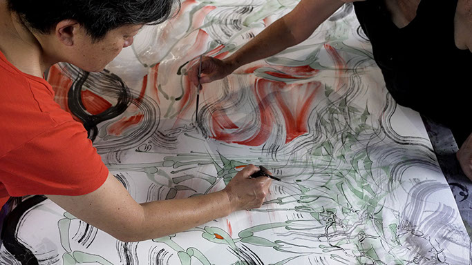 planning the Garden: irrigating the margins. A brush suspended by four strings maneuvered by 4 hands