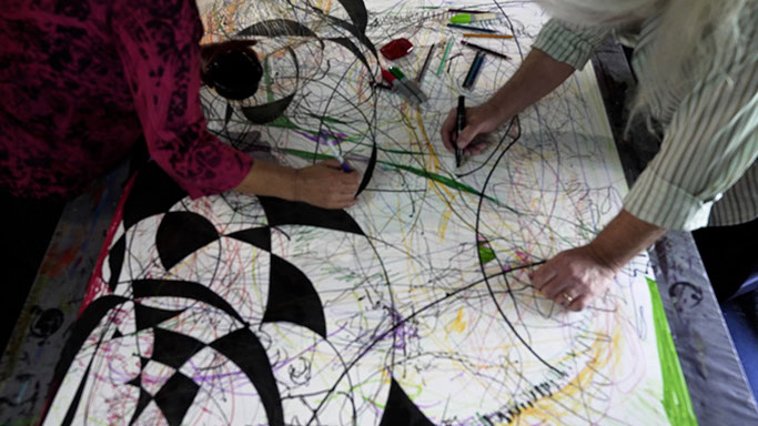 M: This was a new and exciting experience for me and I had no expectations. Carole and I became acquainted during the flow and evolution of the drawing. Although we started with individual visions,we eventually partnered up to create a pathway for the drawing to be completed. I enjoyed the challenge, discovery and surprises along the way. I gained a new awareness and openness to the creative process.