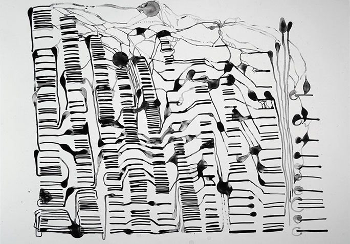 Since March 2020, Vinny has been working on a mammoth scaled project of compositions for orchestra and soloists. In preparation for creating visuals for a selection of these compositions, I invited Vinny to join me in making a collaborative drawing as a means of approach. We listened to this music with our eyes closed, drawing implements in each hand, to lay the groundwork for this complex drawing.